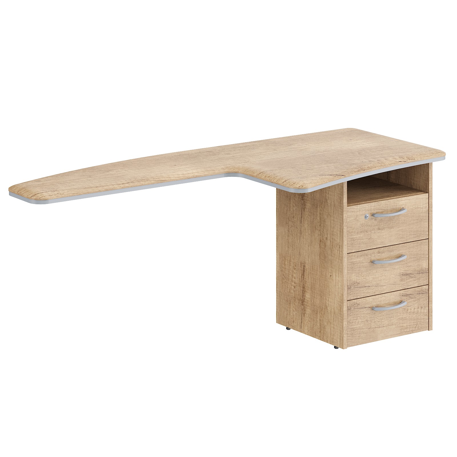 Столешница из МДФ в пленке ПВХ с подложкой из ЛДСП. Общая толщина столешницы 38мм. Каркас тумбы из ЛДСП т.18мм. Ручки металлические с межцентровым расстоянием 160мм, цвет — серебро. Замок на один ящик.