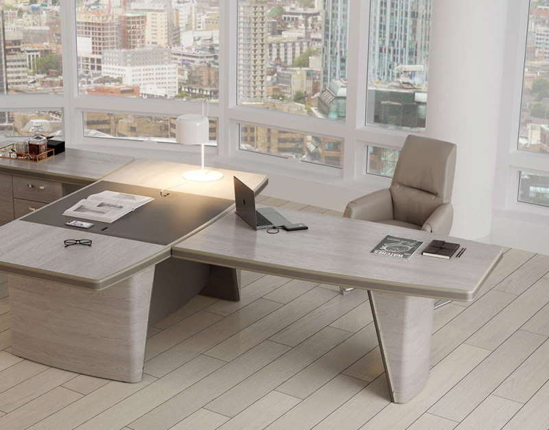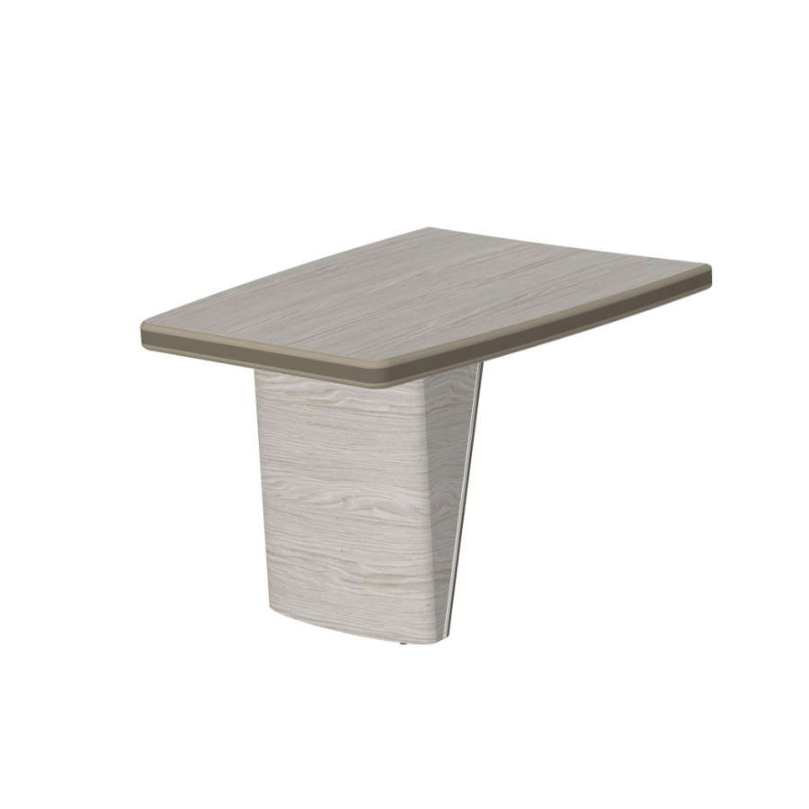 Столешницы столов, боковых приставок и брифингов по торцу декорированы вставками из экокожи. Опоры выполнены в виде объемных коробов треугольной формы с наклонной съемной панелью, обтянутой экокожей. Грани между боковой и лицевой поверхностями коробов скруглены. Опоры декорированы металлическим молдингом с покрытием «хром глянцевый».