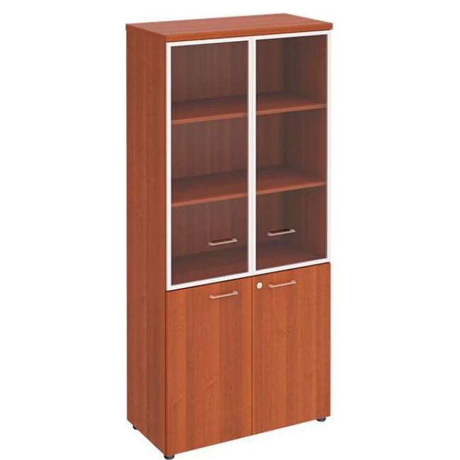 В шкафу применены двери из ЛДСтП с замком на правой двери и двери стеклянные в рамке без замков