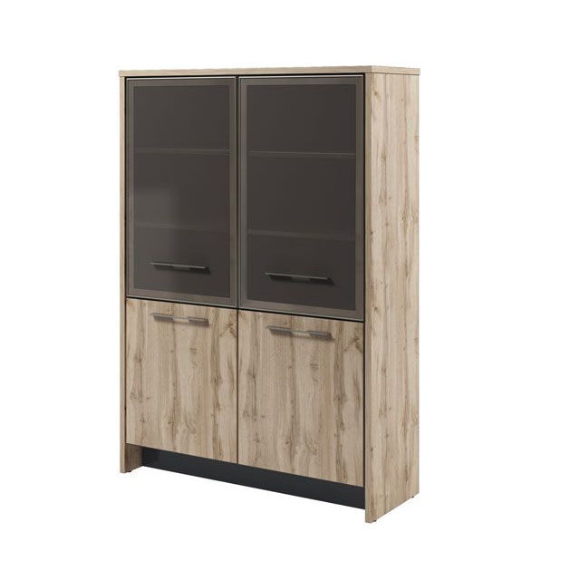 Шкаф двухсекционный с 5 полками в каждой секции. Три полки с возможностью установки на разную высоту. В нижней части двери ЛДСП, сверху — стеклянные двери в алюминиевом профиле. Цвет профиля — «Шампань». Стекло бронзовое матовое.