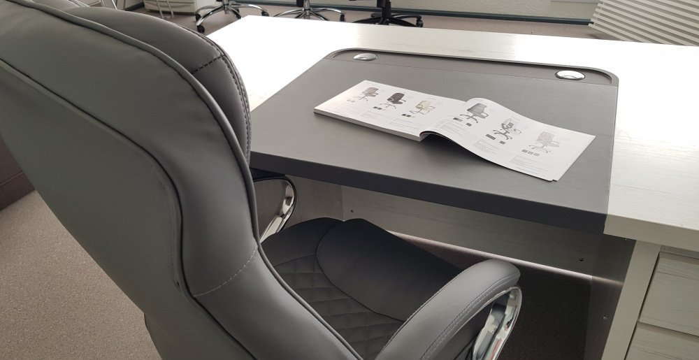 Столы руководителя снабжены бюваром, а конференц-столы — вставками, обтянутыми экокожей.